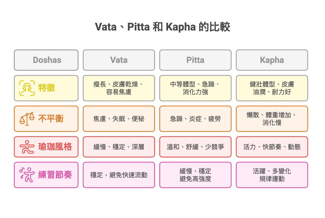 瑜珈源於印度,而在傳統印度醫學——阿育吠陀(Ayurveda)中,體重管理並不是單純計算熱量,而是從「體質平衡」來看待。阿育吠陀認為人體由三種能量體質(Doshas)——Vata(風)、Pitta(火)、Kapha(水土) 所主導。肥胖與體重難以控制,往往與 Kapha(過重、停滯) 失衡有關。