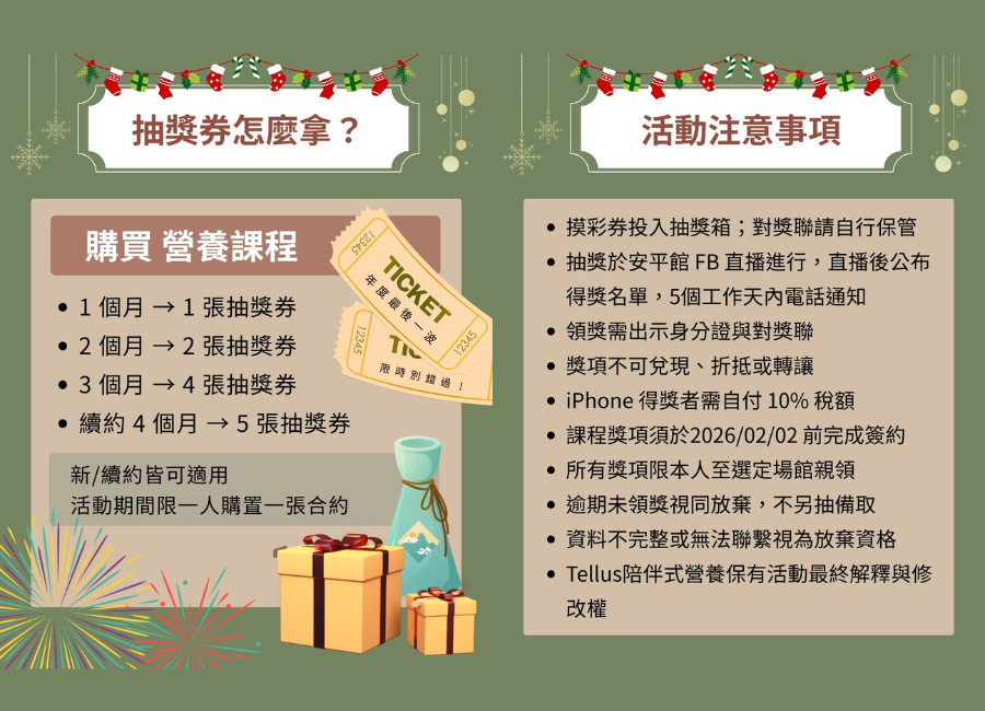 #Tellus陪伴式營養 #台南營養師 #營養師推薦 #聖誕抽獎 #跨年活動 #營養課程 #健康飲食 #體態管理 #抽獎 #iPhone17Pro #健康生活