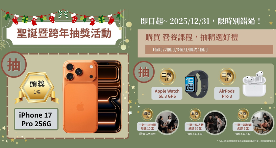 只要在 12 月購課,不只開始變健康,更有機會把 iPhone 17 Pro、Apple Watch、AirPods Pro 3 等 37 個獎項直接帶回家!🎁